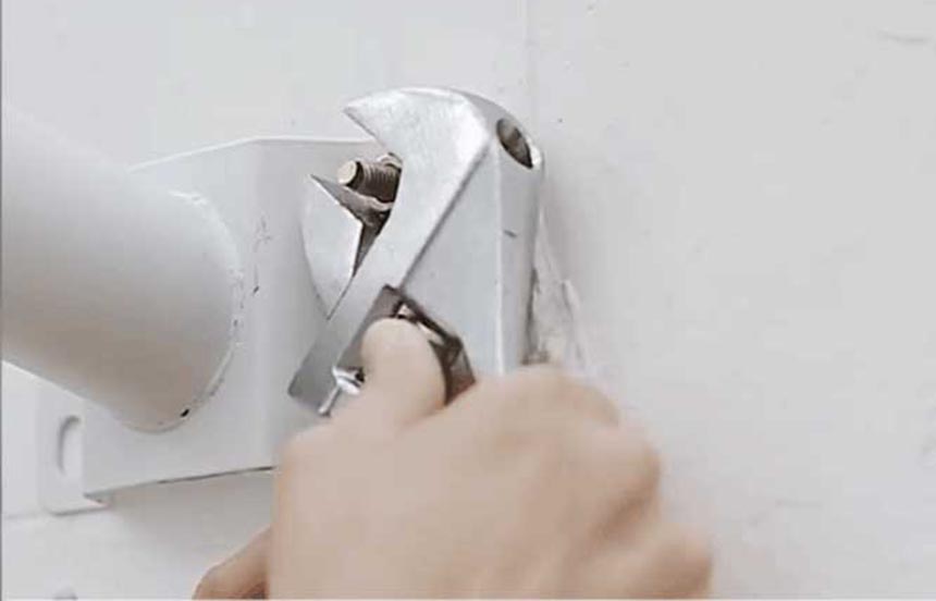 - Dùng máy khoan tường khoan 2 lỗ đã đánh dấu rồi đặt thanh đỡ sau đó đóng tắc kê xuống bằng búa cho thật chặt.